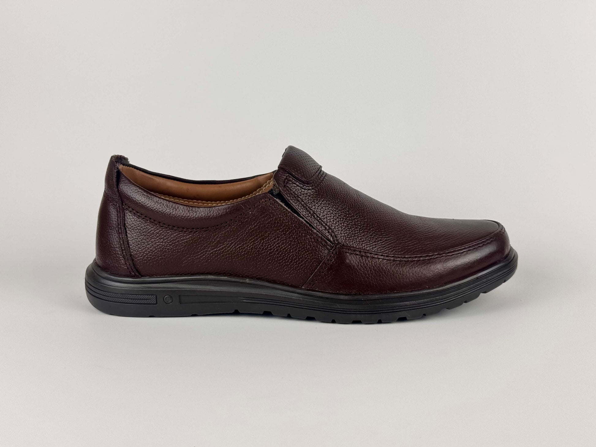 Men’s slip-ons crafted from soft leather, featuring a small needle leather patch on the front tongue for a subtle, stylish detail.