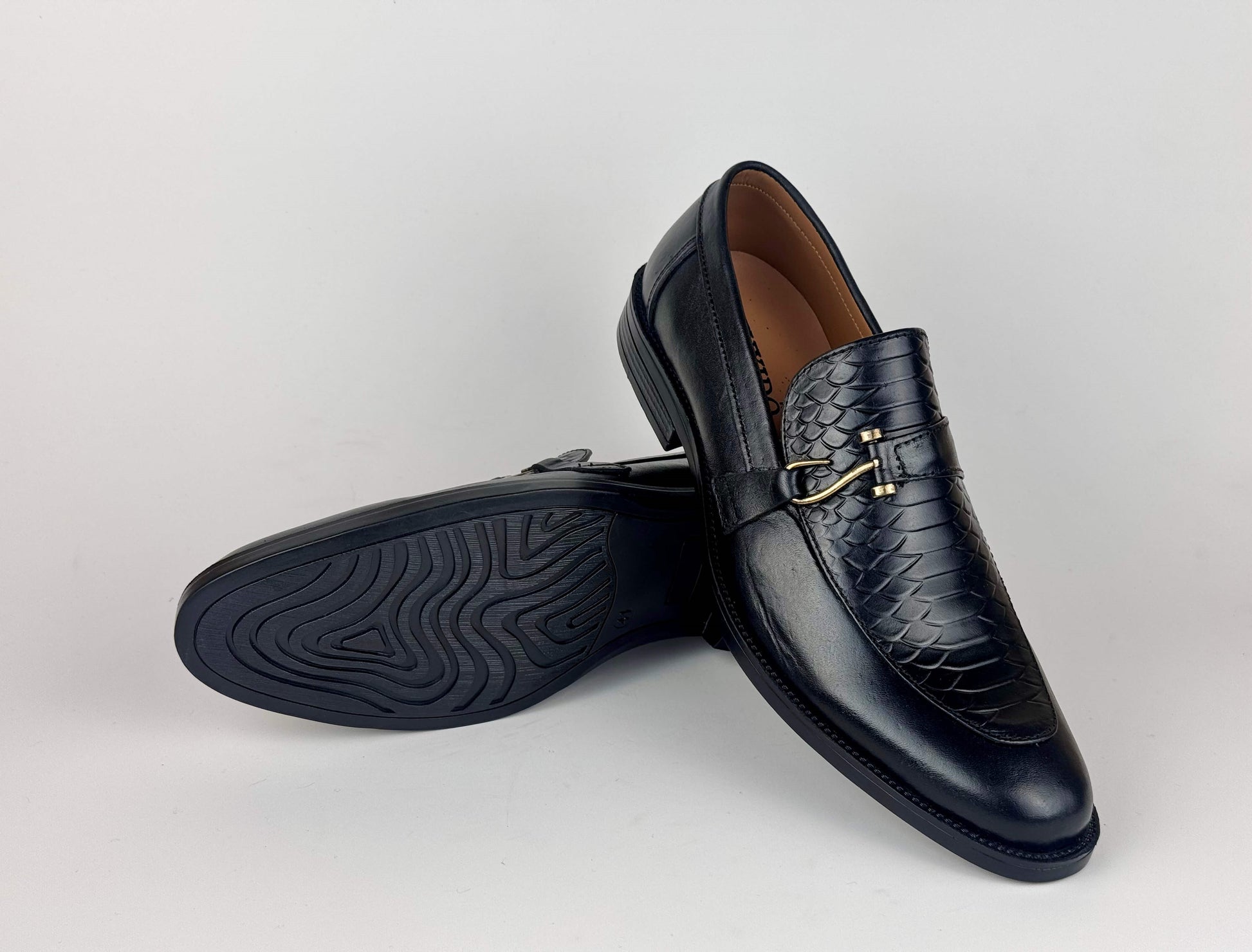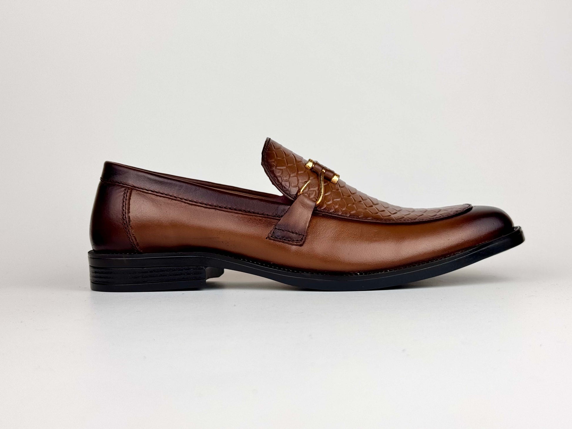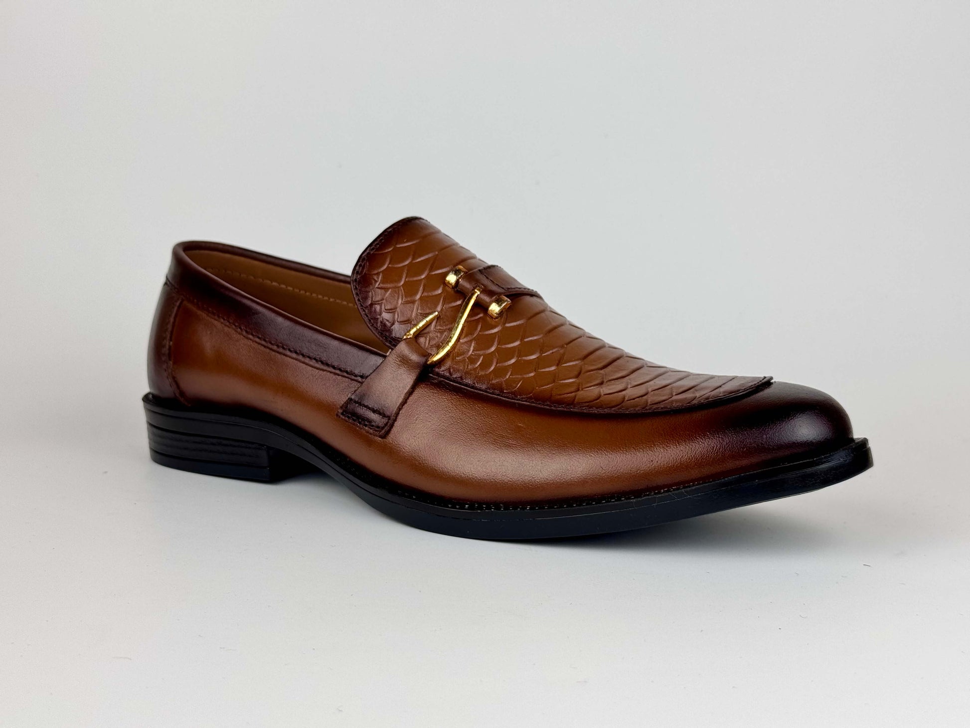 A sophisticated men’s dress shoe crafted from premium burnished leather, elevated with a refined scaled embossed texture on the front. The signature hook-style metallic buckle adds a touch of modern elegance, blending classic craftsmanship with contemporary detailing. Designed for formal occasions and polished everyday wear, this shoe delivers a luxurious finish, exceptional comfort, and a distinguished appearance that stands out effortlessly.