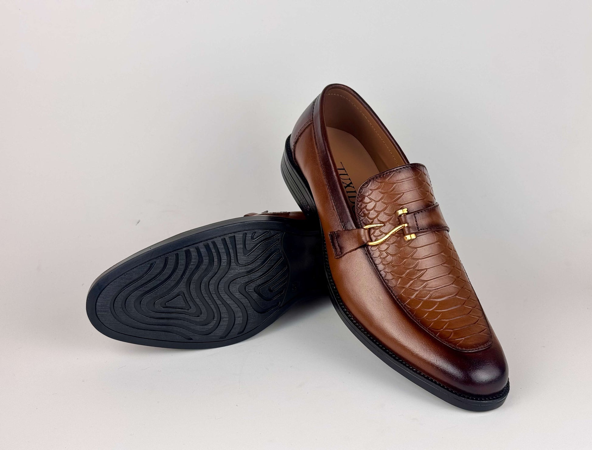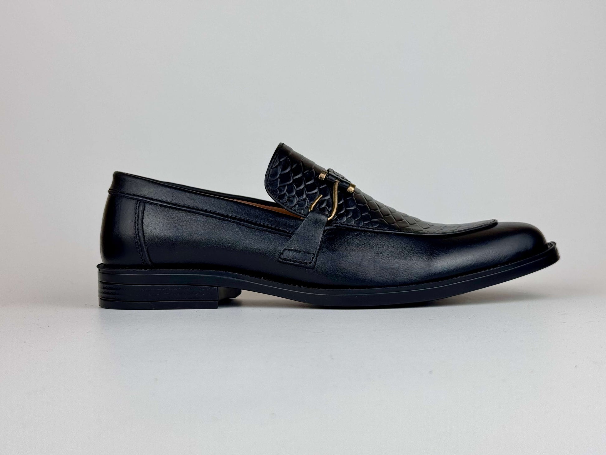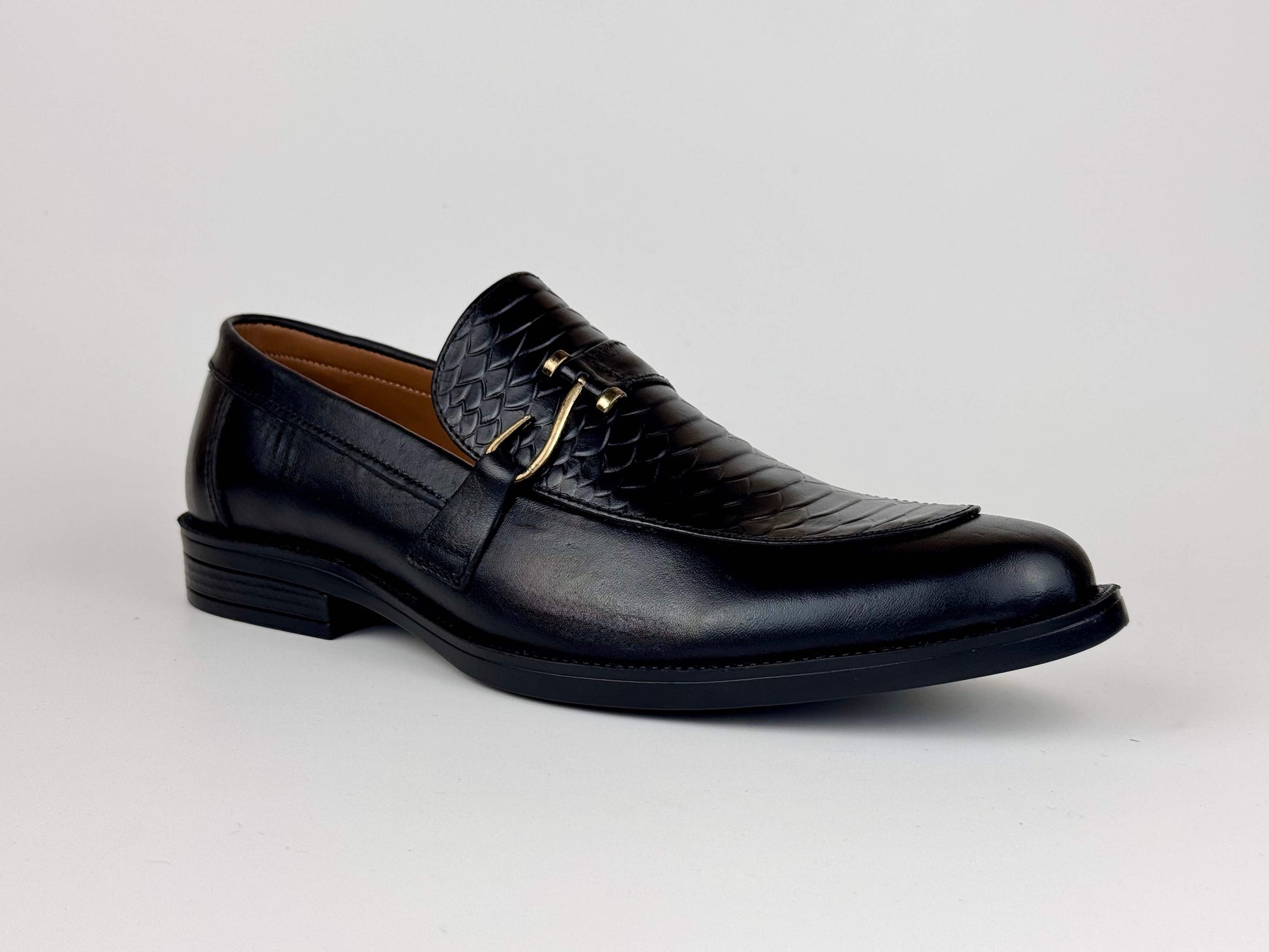 A sophisticated men’s dress shoe crafted from premium burnished leather, elevated with a refined scaled embossed texture on the front. The signature hook-style metallic buckle adds a touch of modern elegance, blending classic craftsmanship with contemporary detailing. Designed for formal occasions and polished everyday wear, this shoe delivers a luxurious finish, exceptional comfort, and a distinguished appearance that stands out effortlessly.
