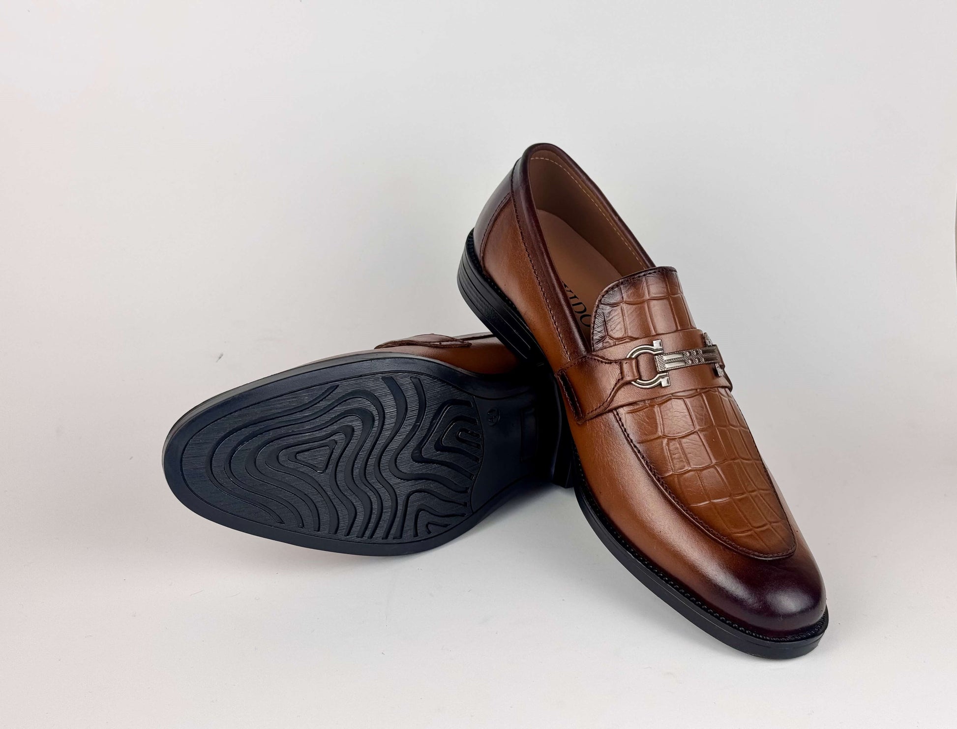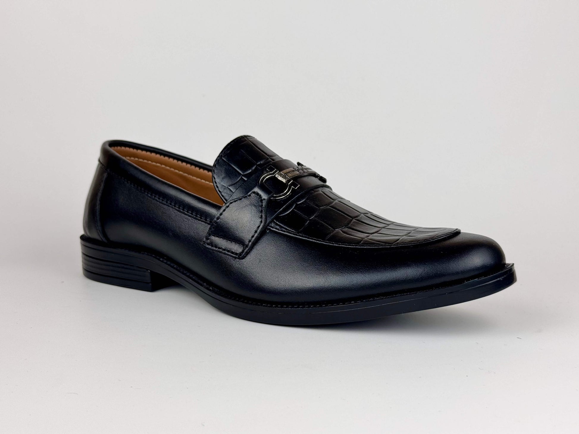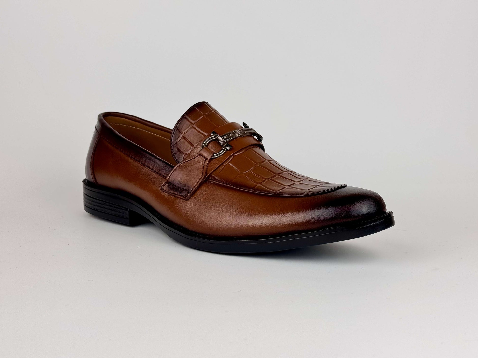 A refined men’s dress shoe crafted from soft, premium leather, highlighted by a crocodile-textured front that adds a touch of bold sophistication. The sleek metallic buckle enhances its modern appeal, creating a perfect blend of elegance and contemporary style. Designed for comfort and durability, this shoe is ideal for formal events, office wear, or any occasion where you want to stand out with timeless class.