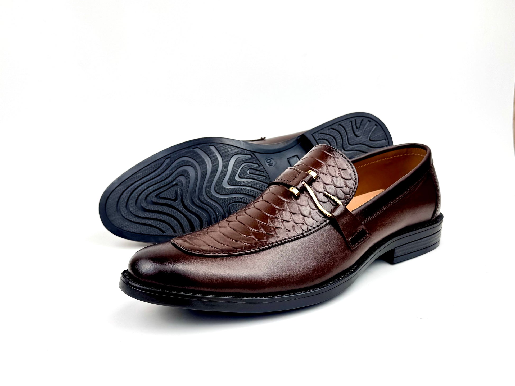 A sophisticated men’s dress shoe crafted from premium burnished leather, elevated with a refined scaled embossed texture on the front. The signature hook-style metallic buckle adds a touch of modern elegance, blending classic craftsmanship with contemporary detailing. Designed for formal occasions and polished everyday wear, this shoe delivers a luxurious finish, exceptional comfort, and a distinguished appearance that stands out effortlessly.